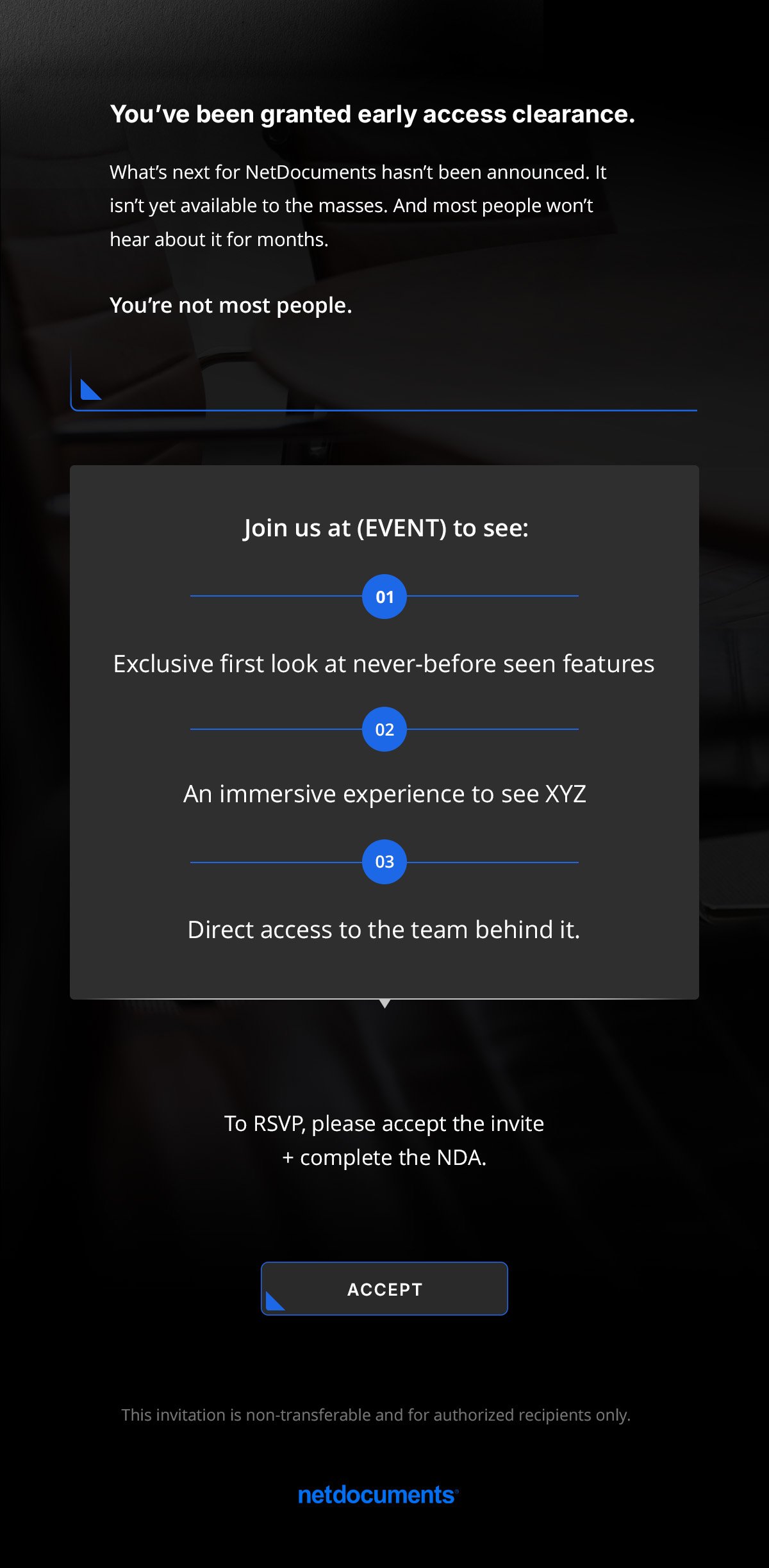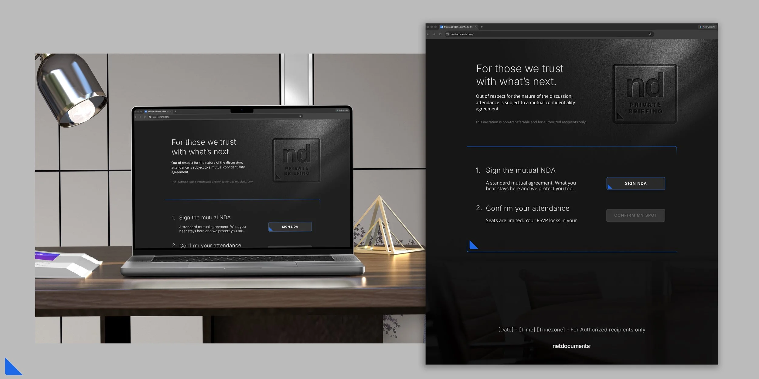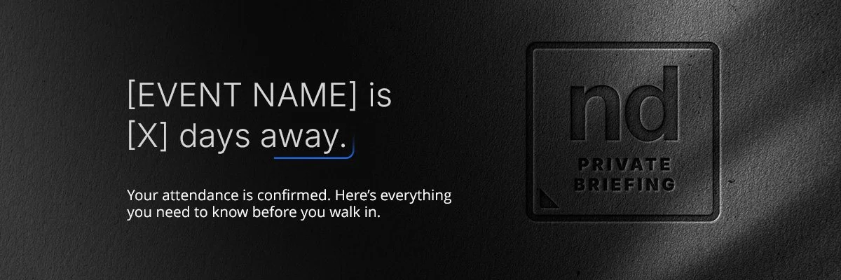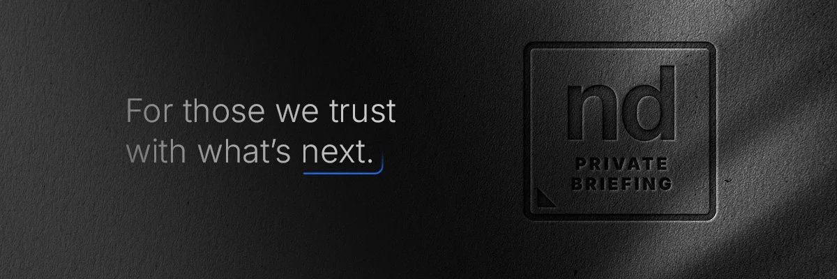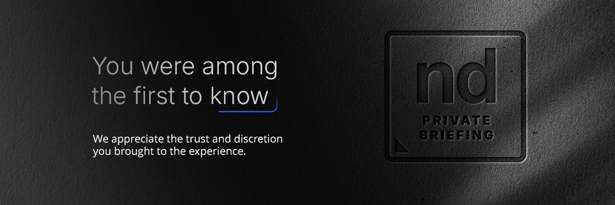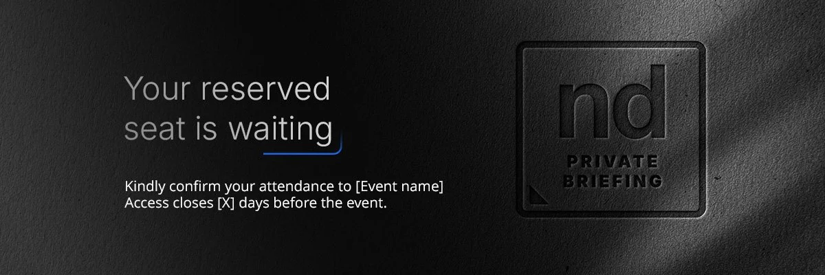 A private, invitation-only experience for executive audiences, where discretion, select access, and high-level perspective define the exchange. The Palette is Black on Black with the ND Blue Accent. This communicates luxury and exclusivity through restraint; it doesn’t seek attention, it rewards it.